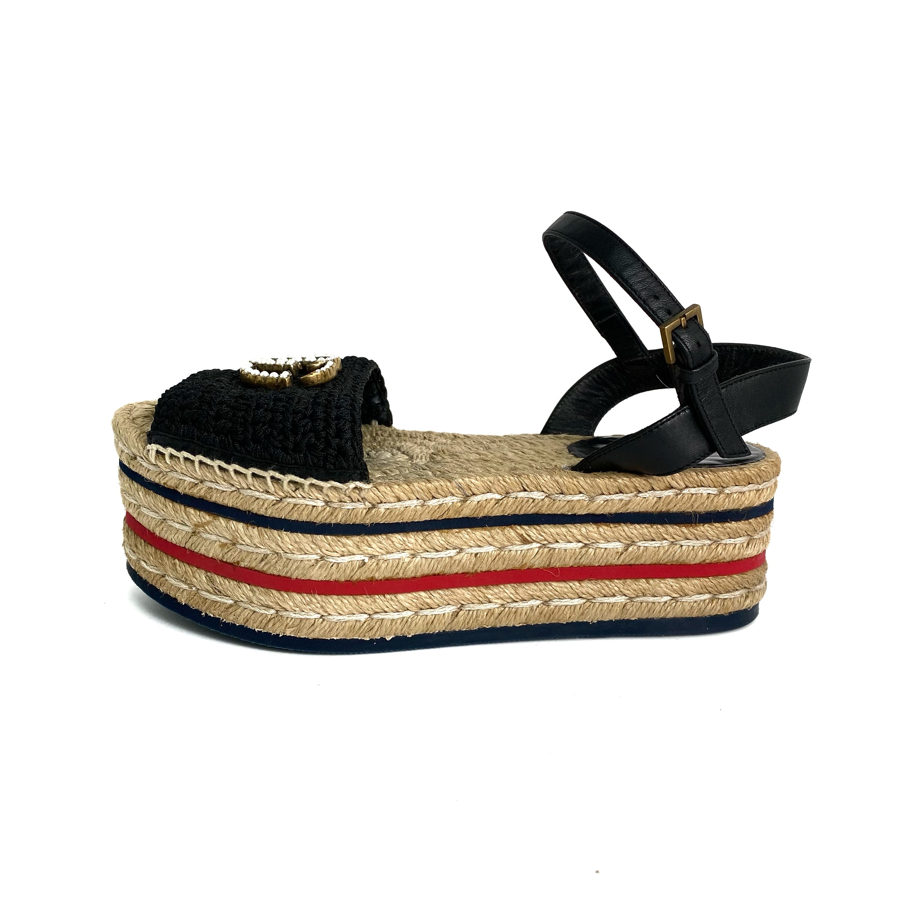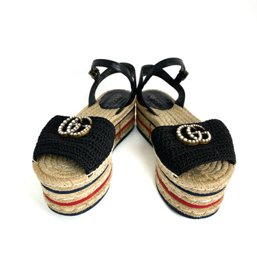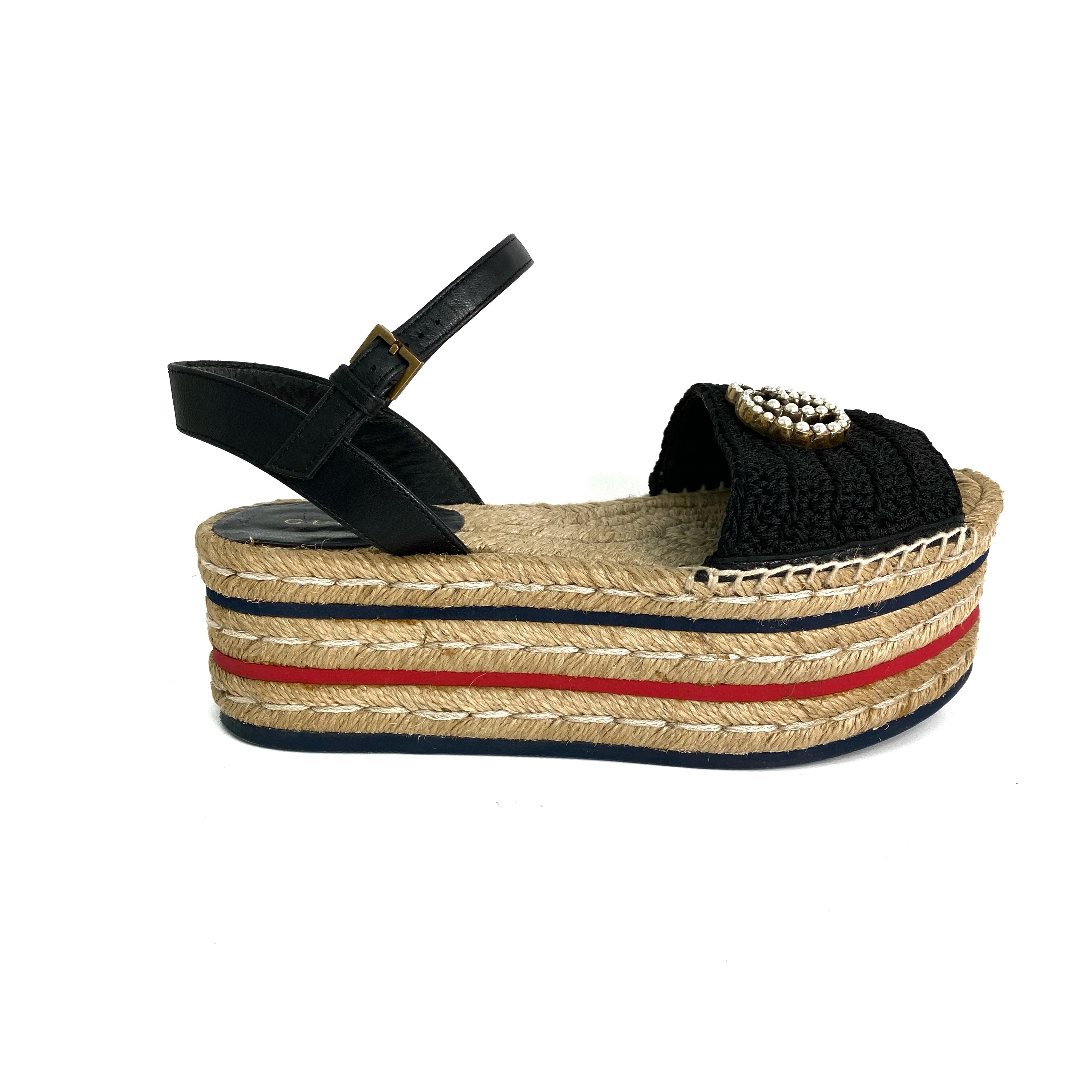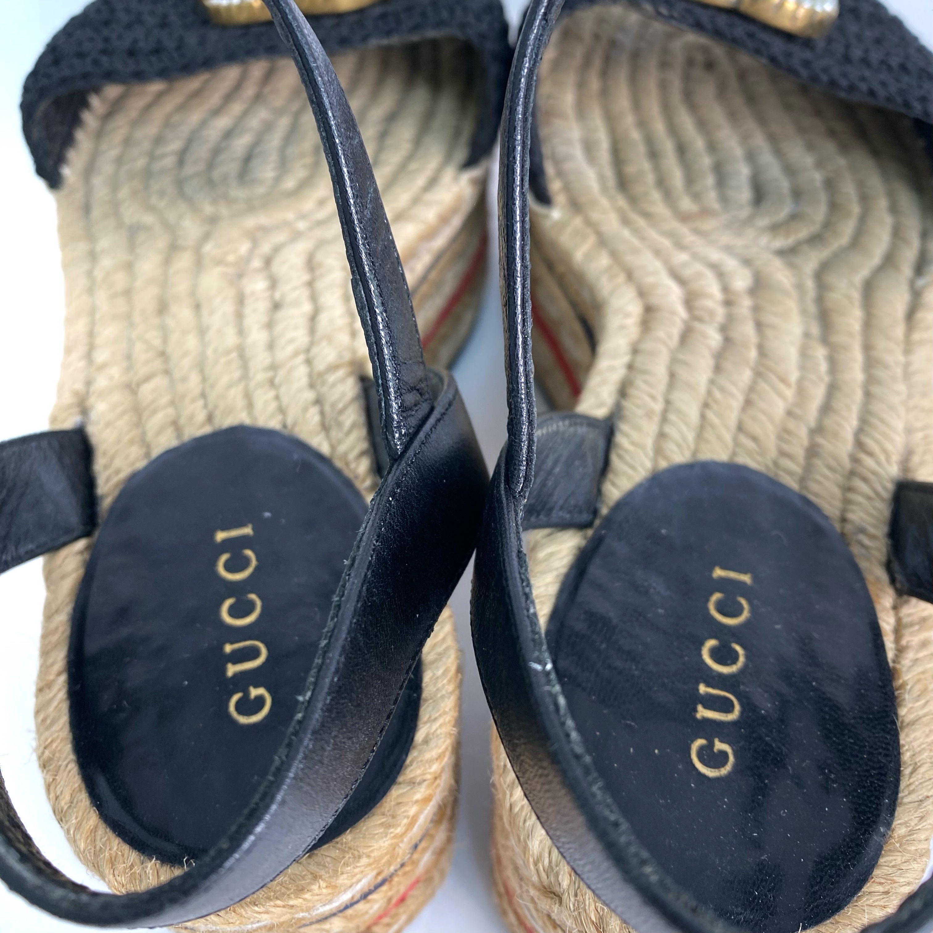 ☆ Gucci 古馳 Black Canvas Calfskin Straw Sandals #34.5 黑色帆布小牛皮草編涼鞋 34.5碼 - 257028920