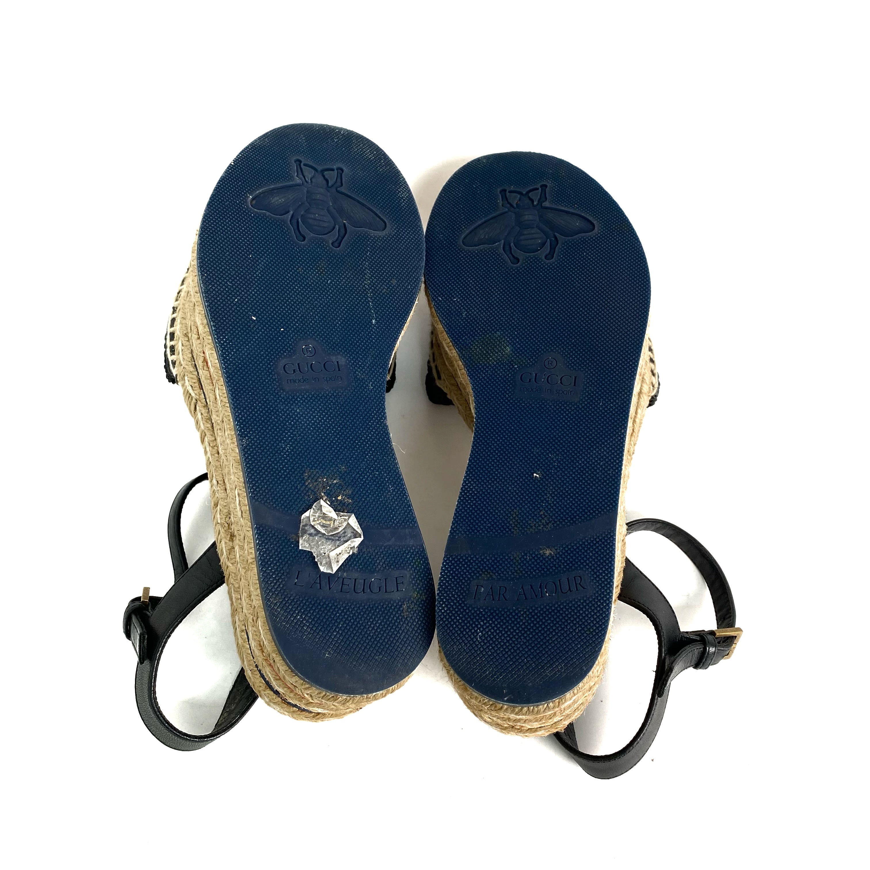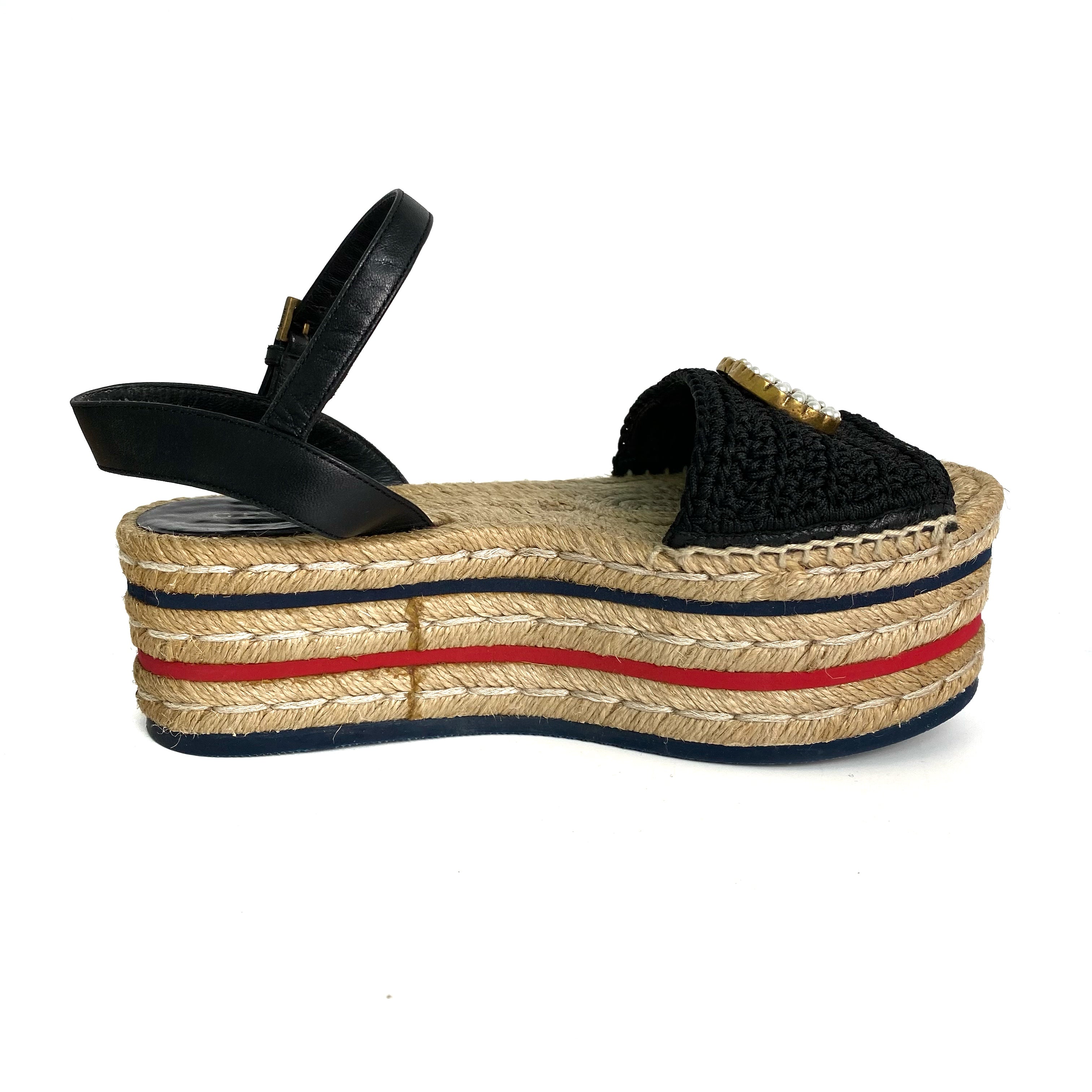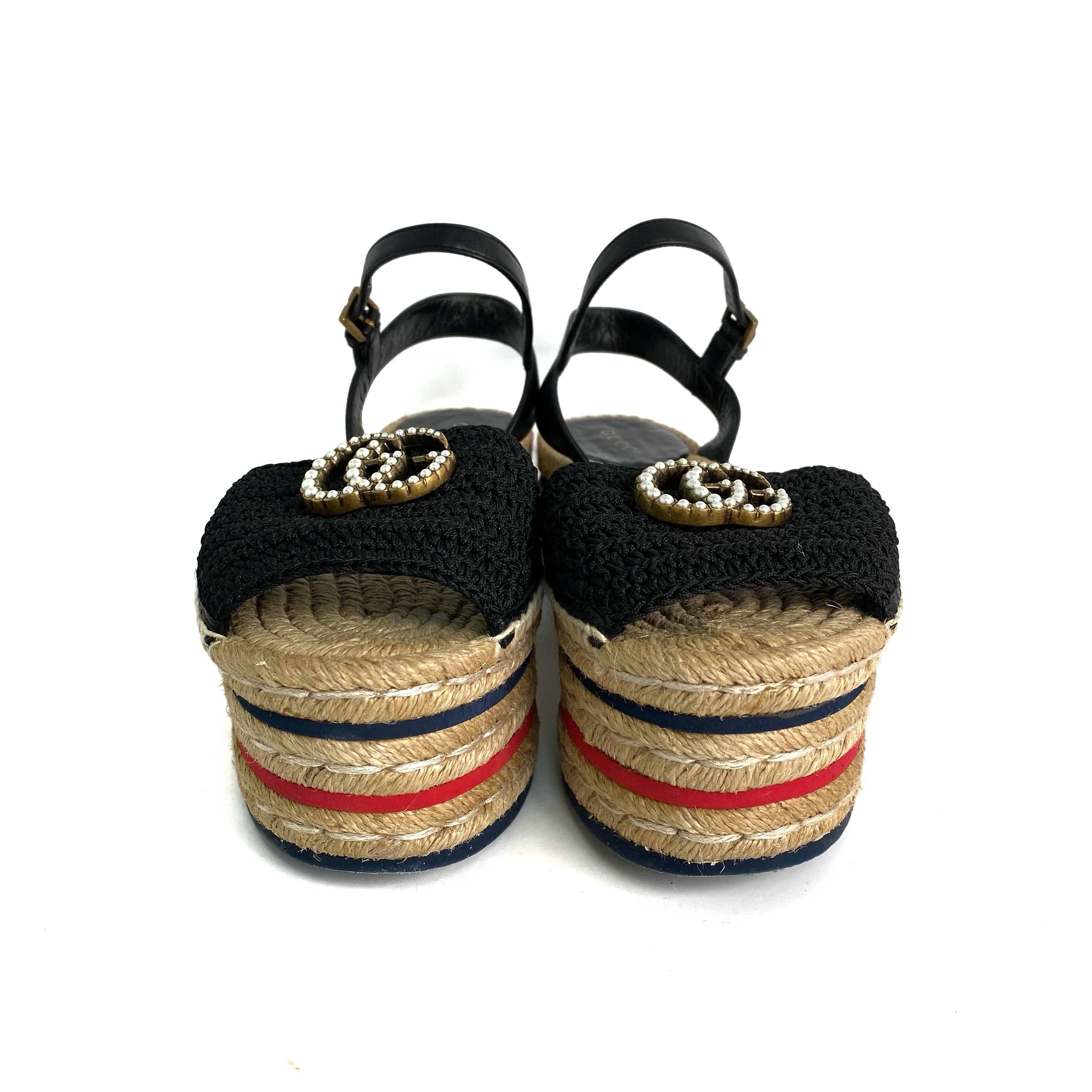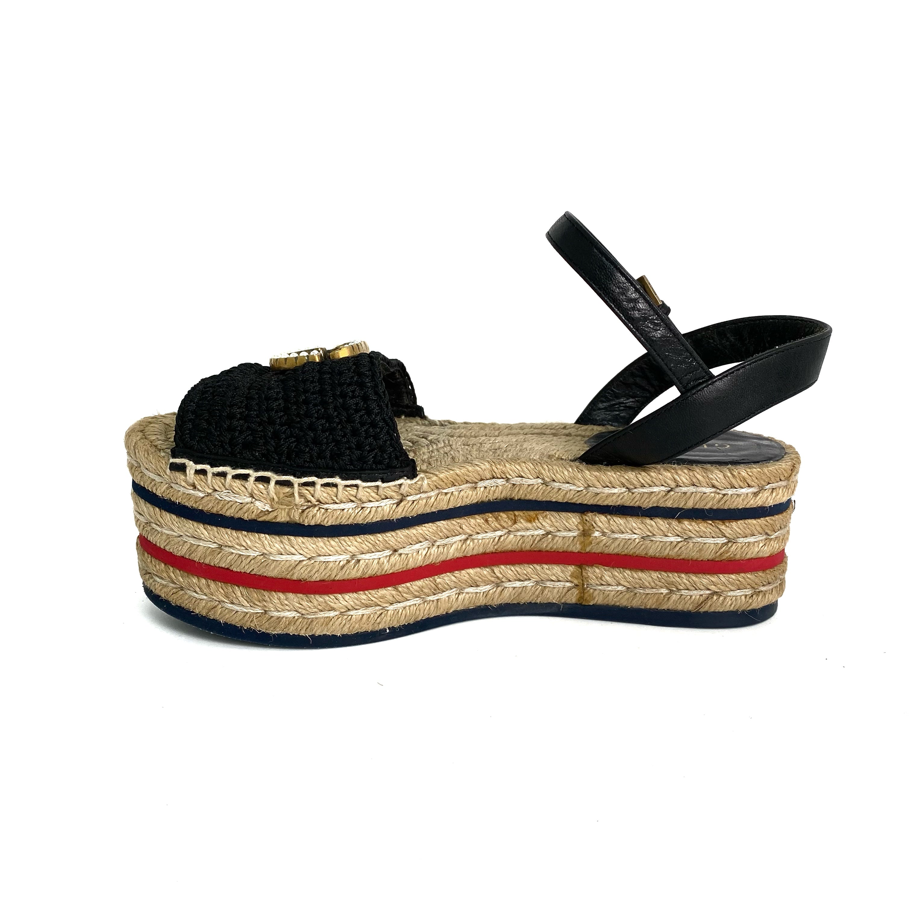 ☆ Gucci 古馳 Black Canvas Calfskin Straw Sandals #34.5 黑色帆布小牛皮草編涼鞋 34.5碼 - 257028920