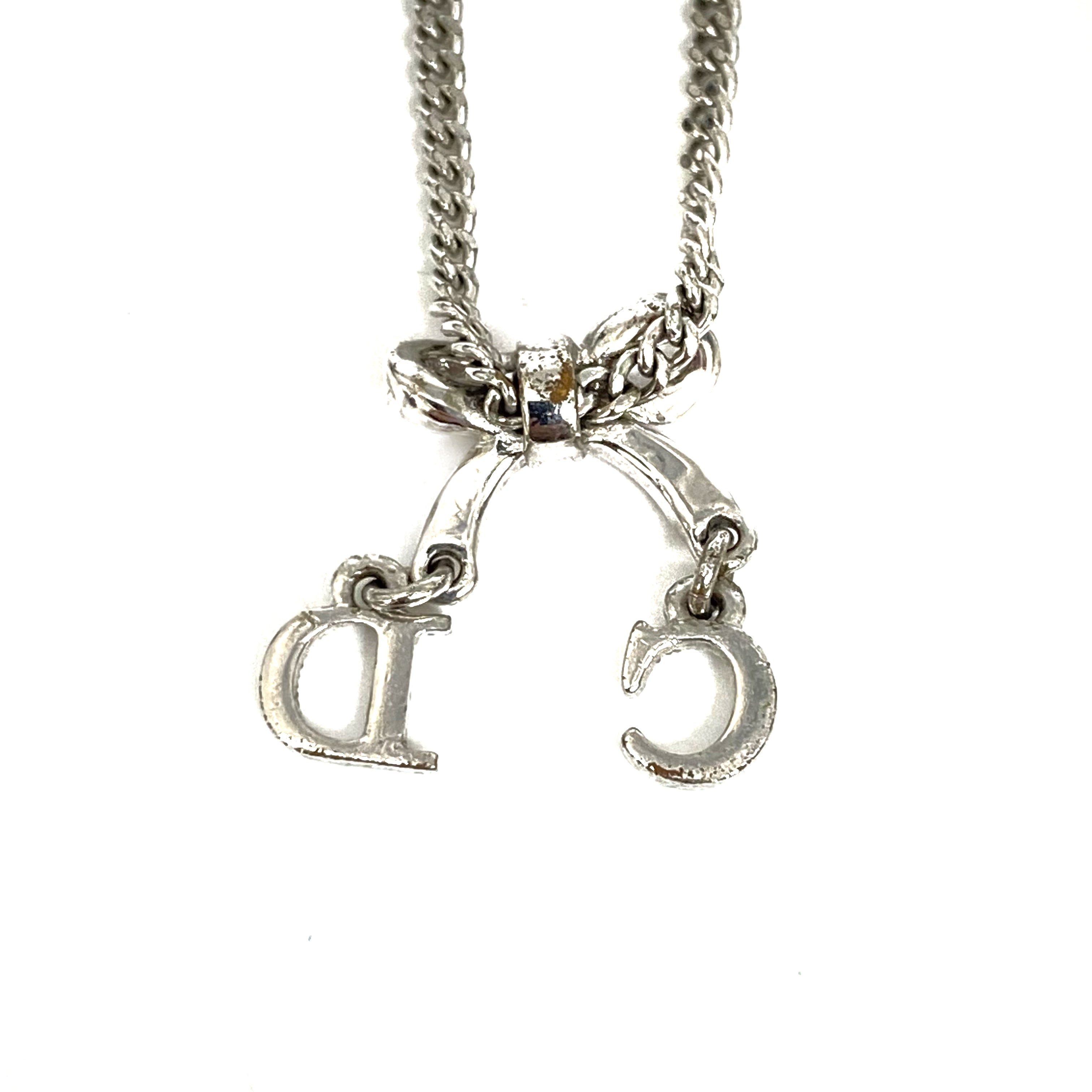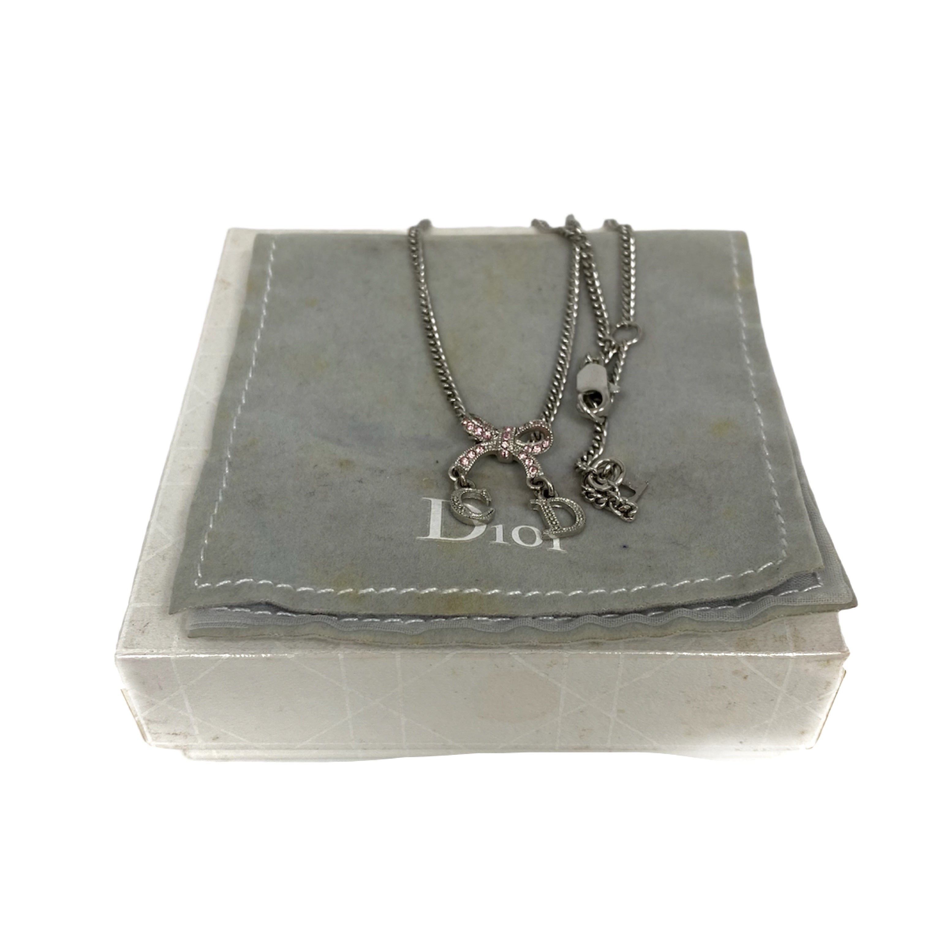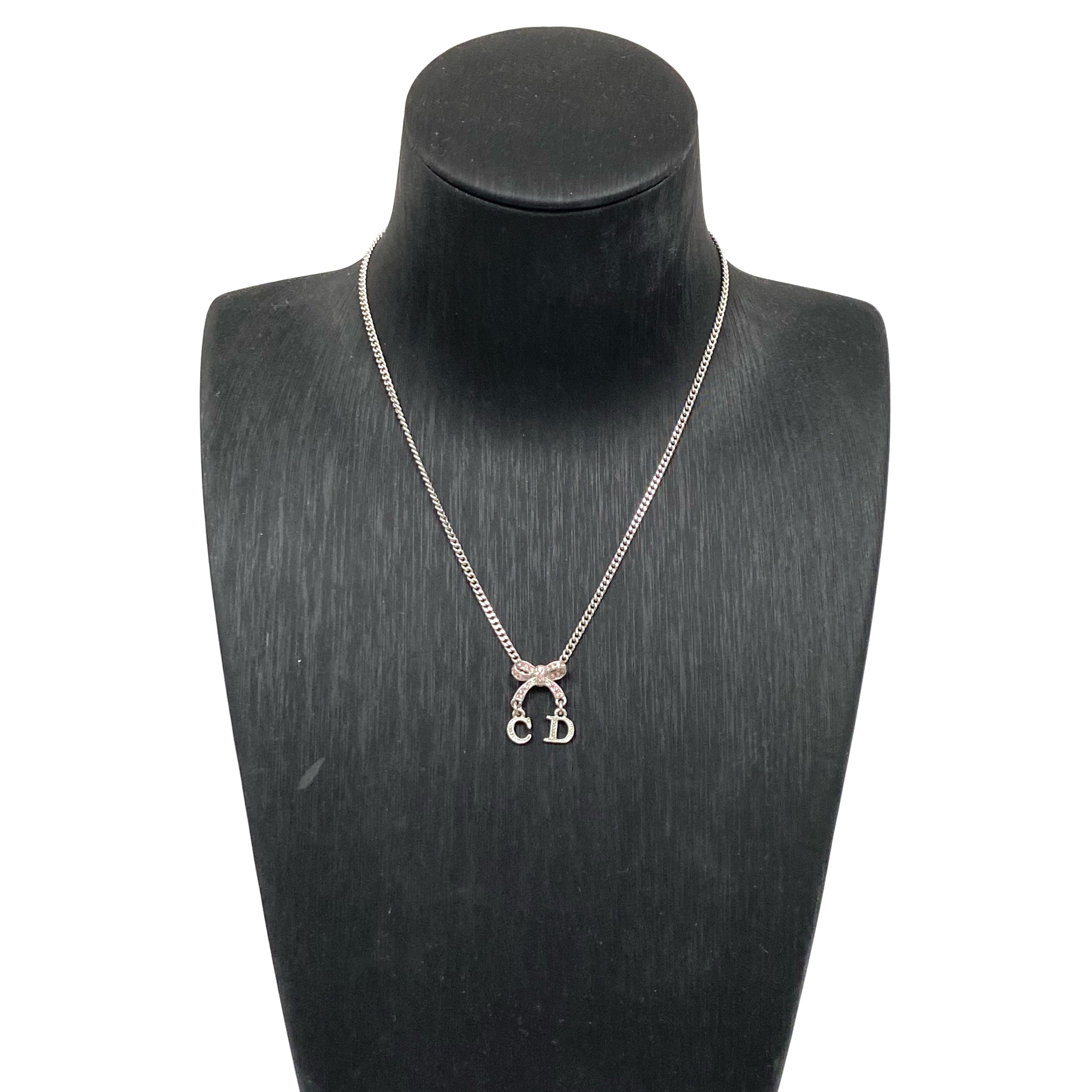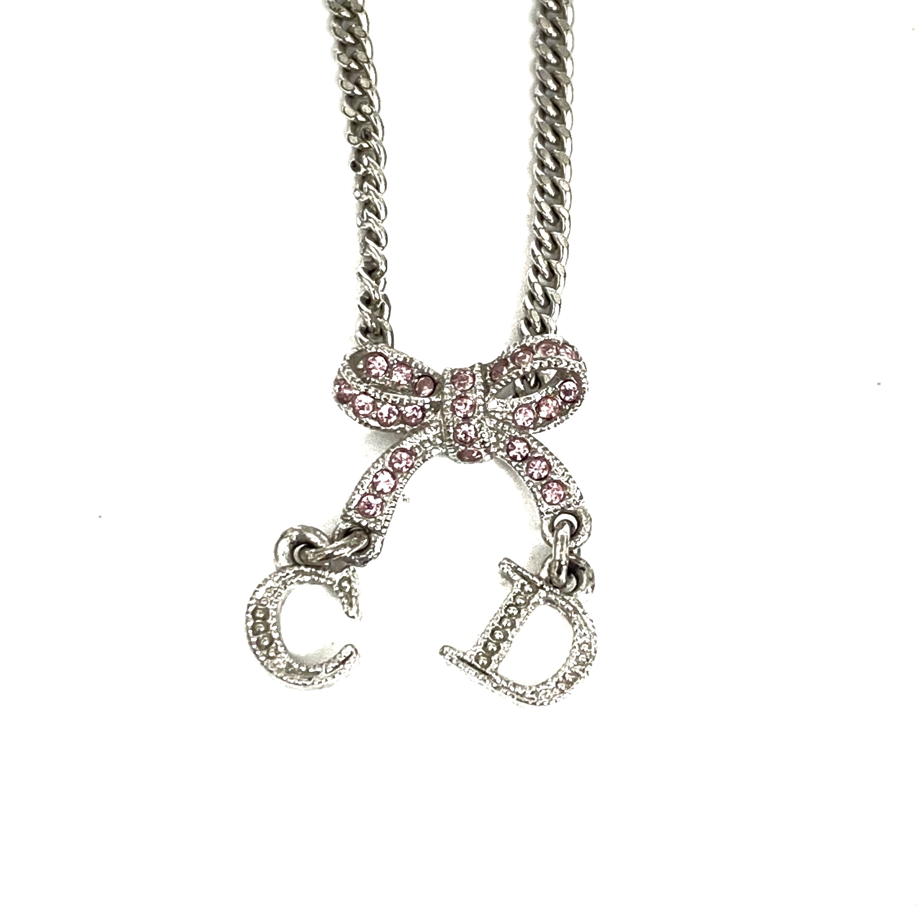 ☆ Christian Dior 迪奧 Pink Silver-tone Metal Rhinestone Ribbon Necklace 粉紅色銀色金屬蝴蝶結頸鏈 - 257025086