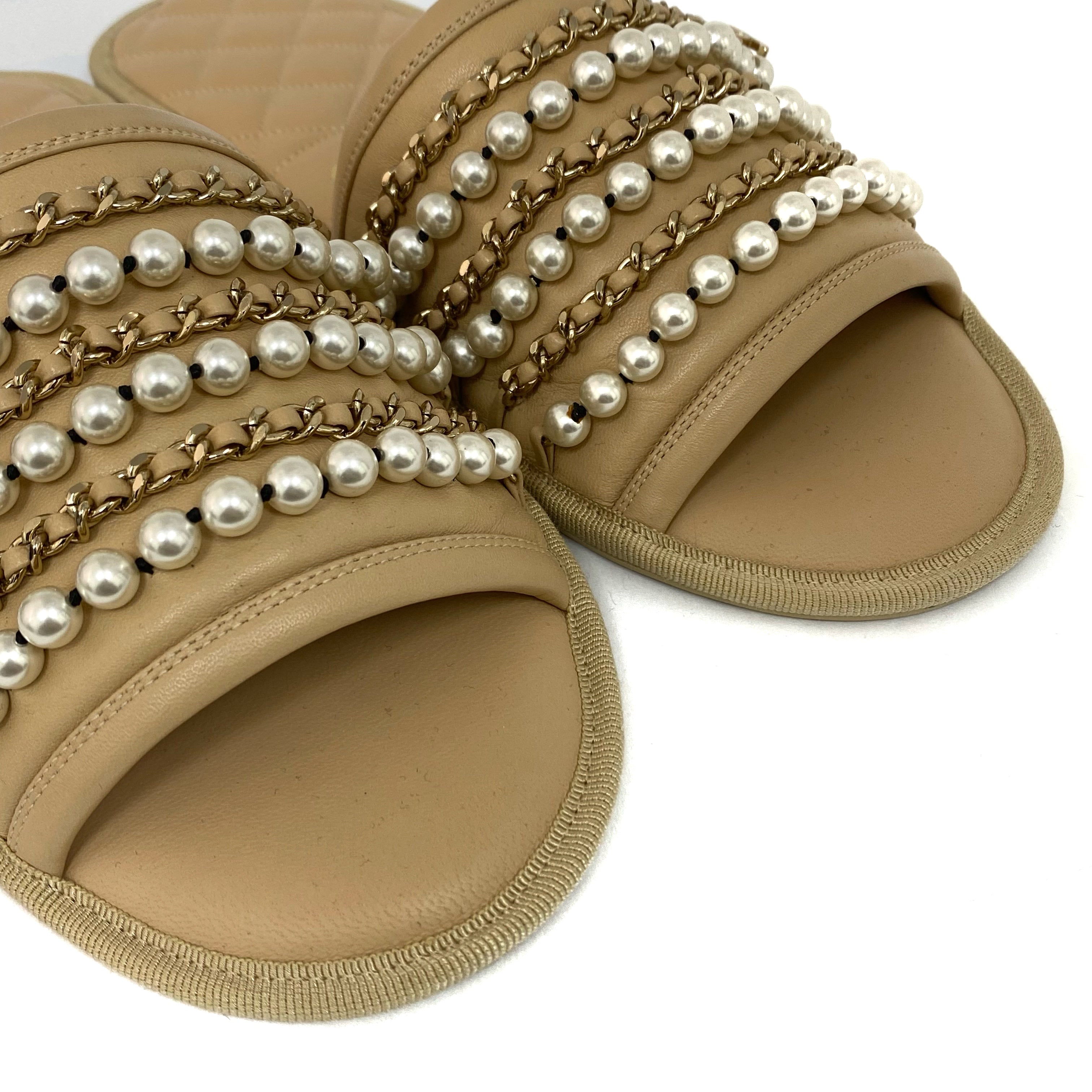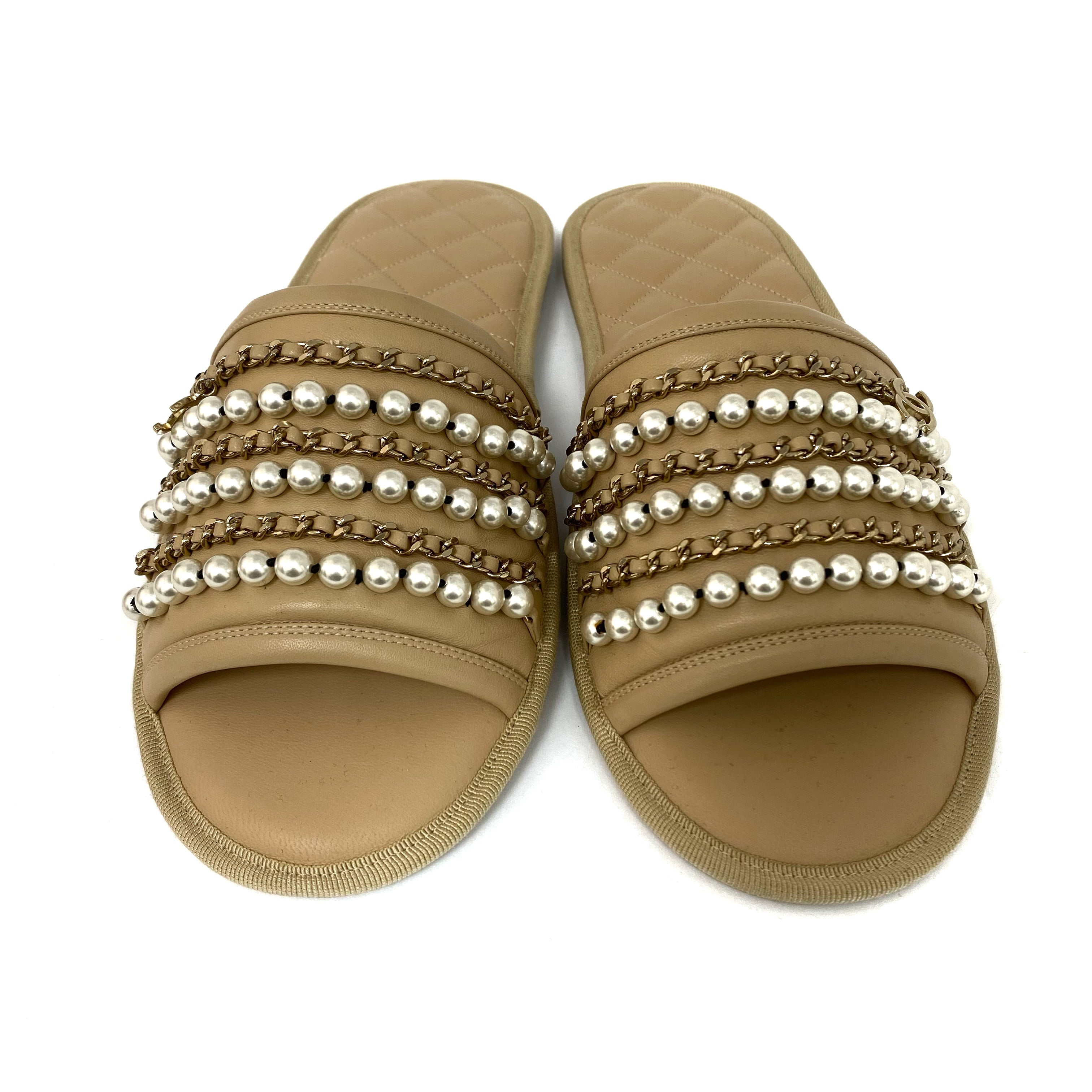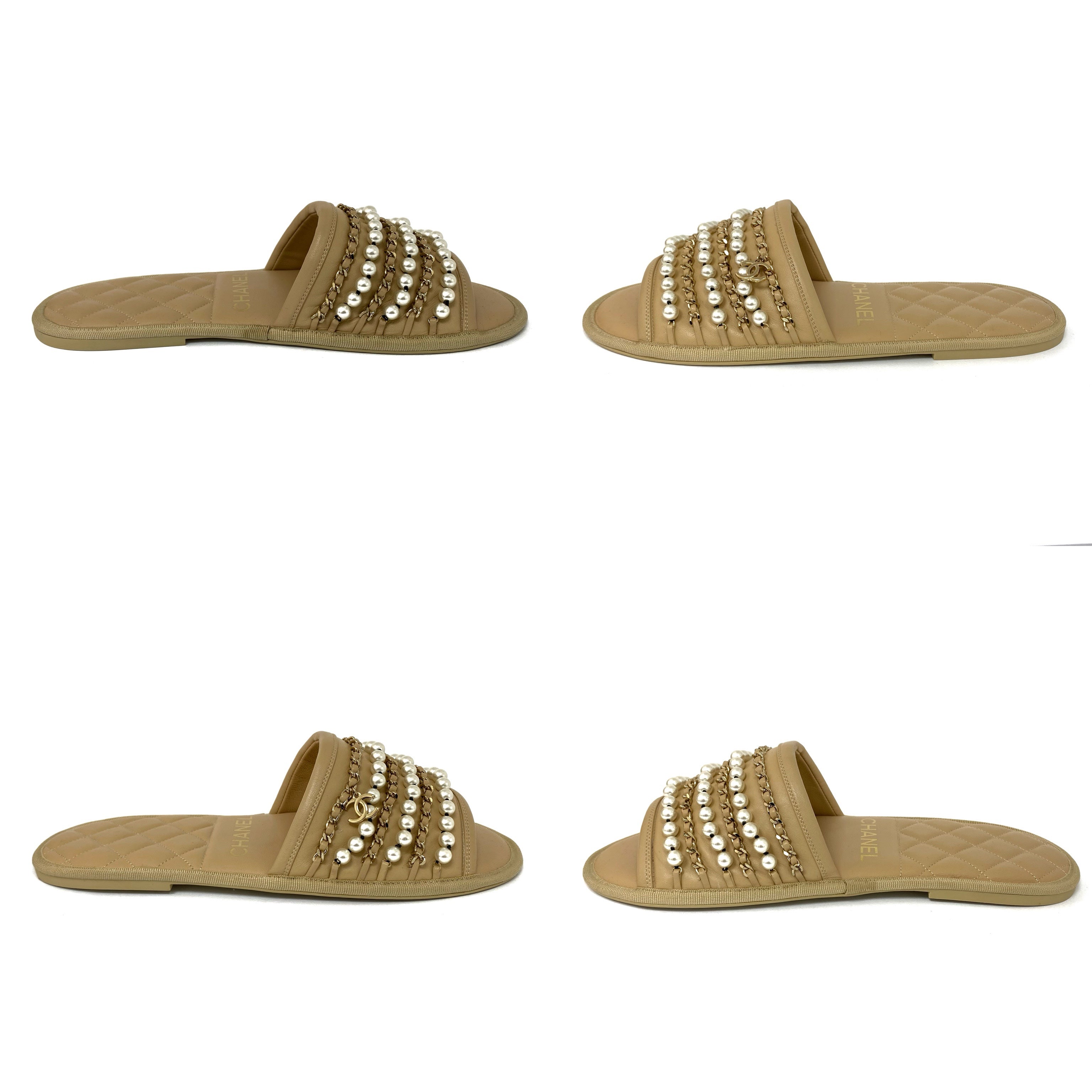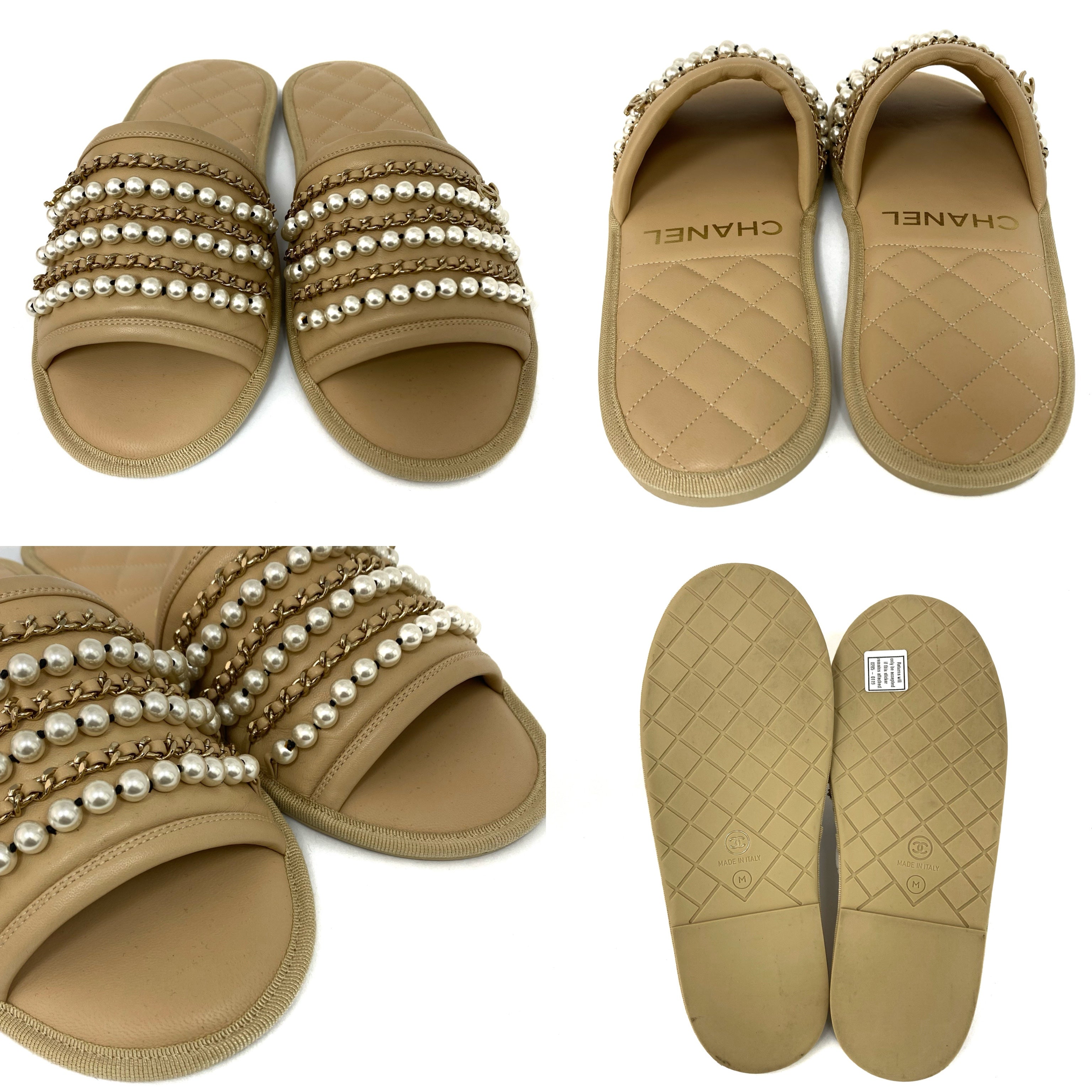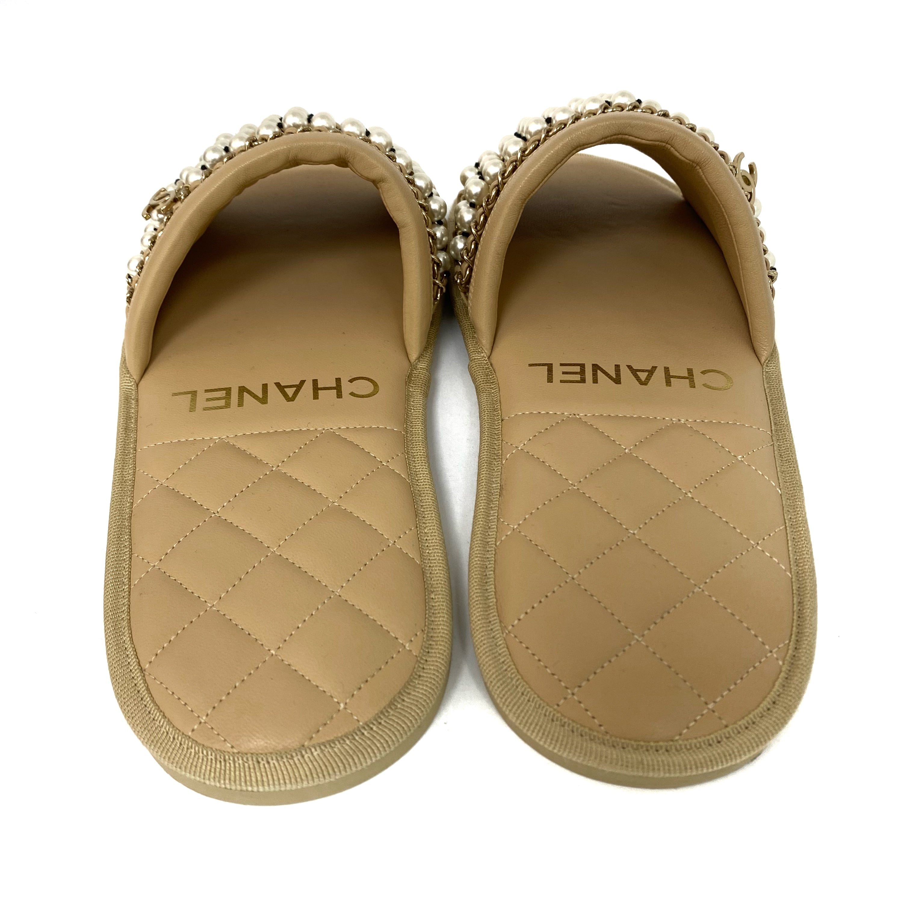 ☆Chanel香奈兒 Beige Calfskin Faux Pearl Slippers M Size 淺褐色小牛皮仿珍珠拖鞋 M 碼 -257022319