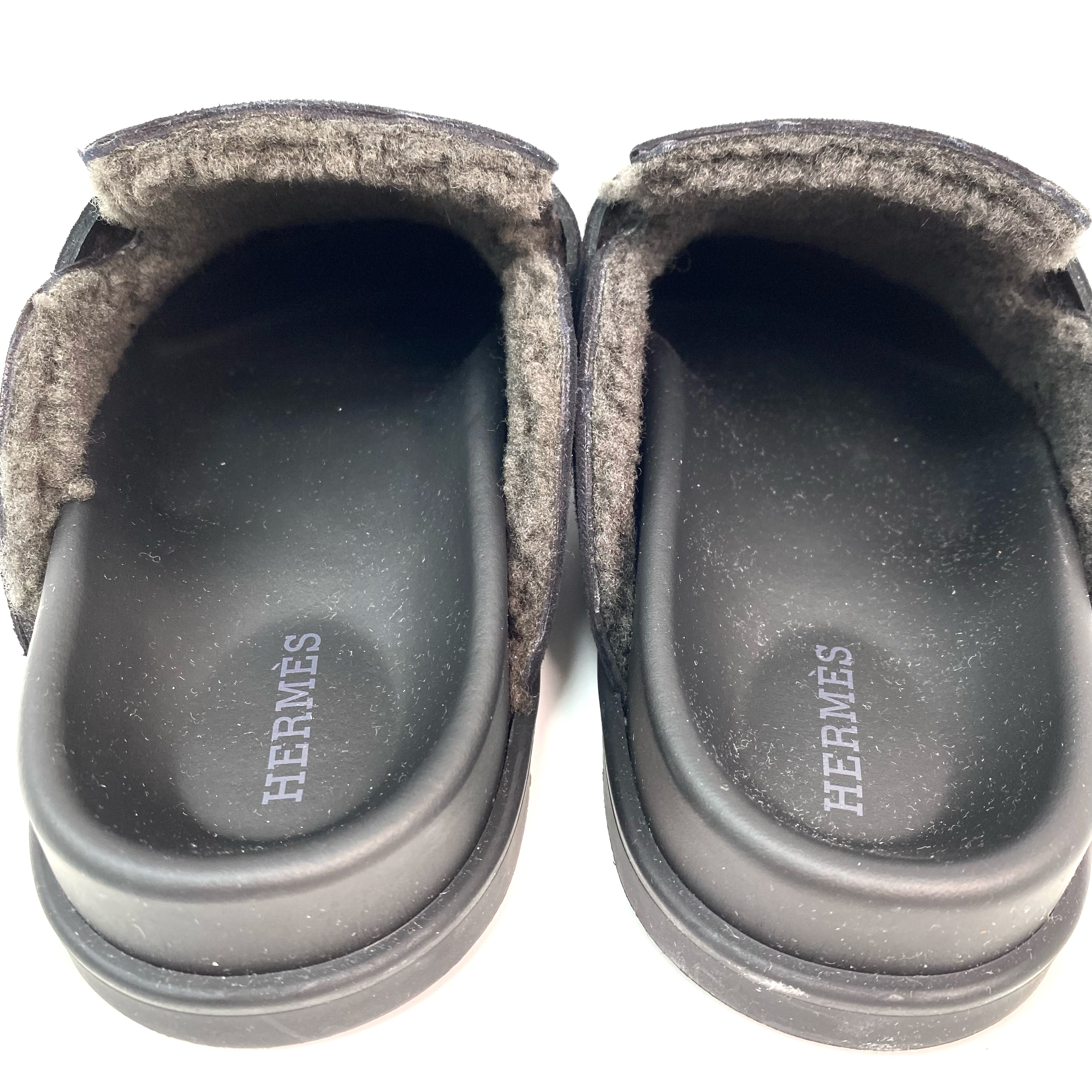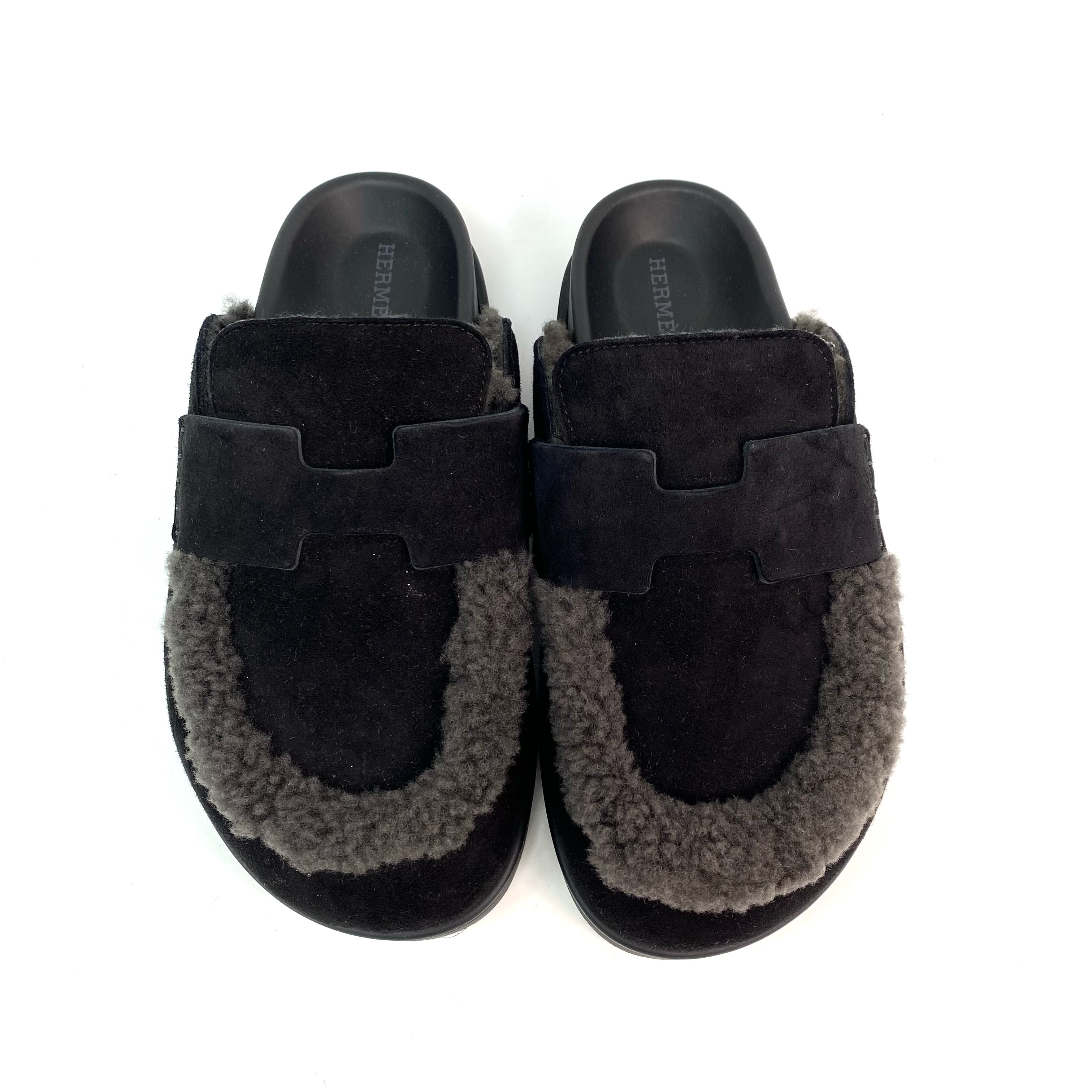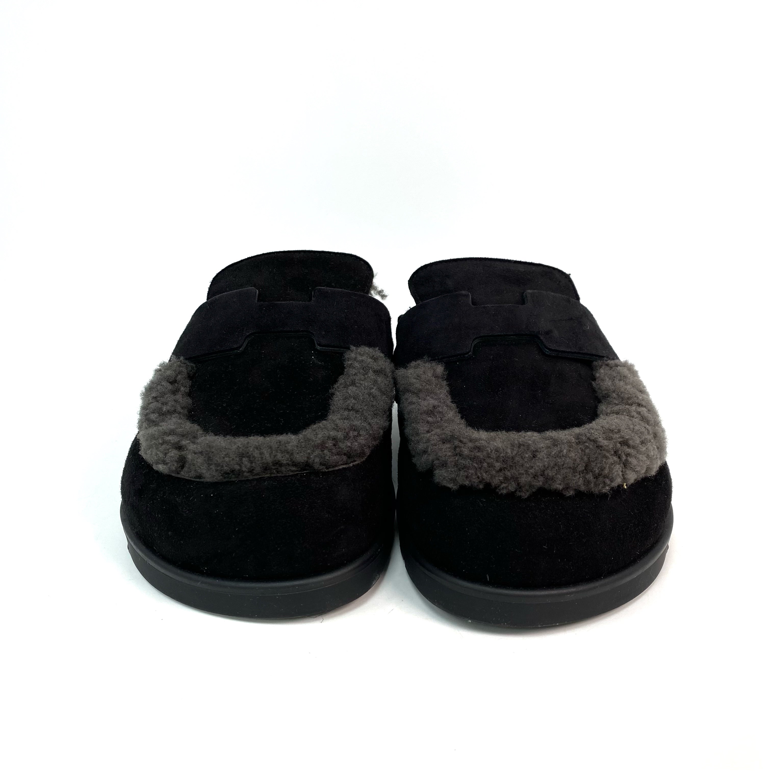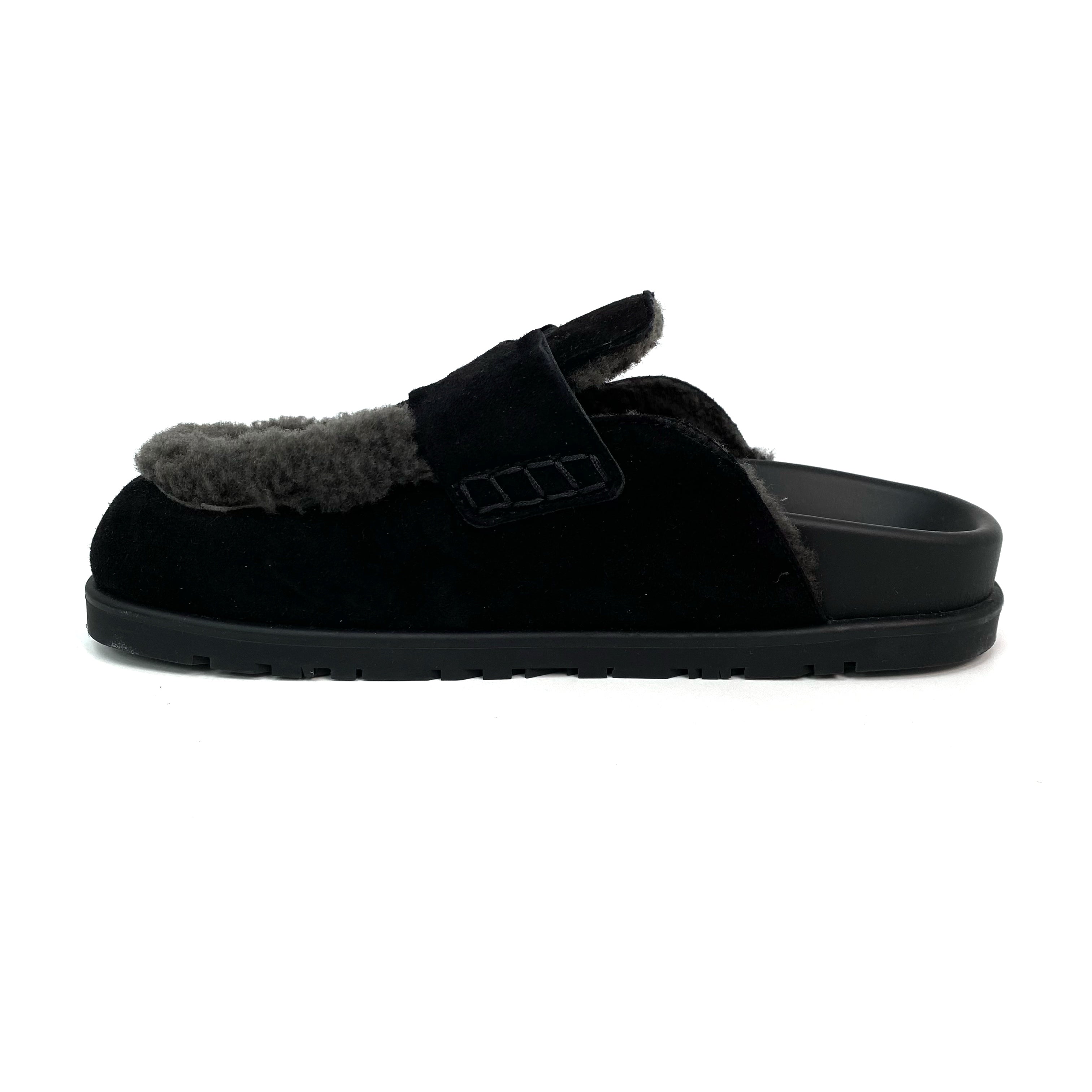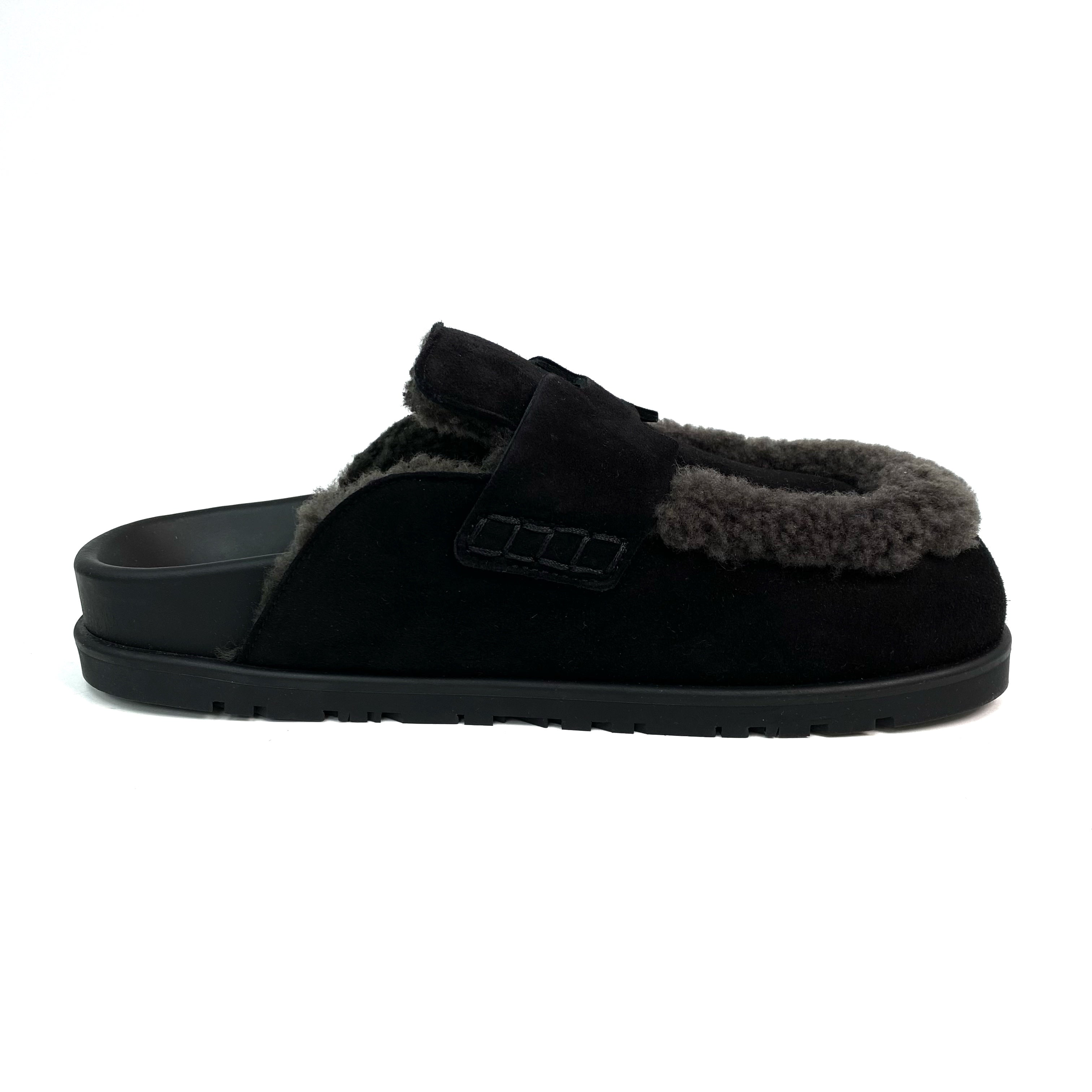 ☆ Hermes 愛馬仕 Noir Gris Foncé Suede Goatskin Shearling Go Mules #35 黑灰色山羊麂皮剪羊毛穆勒鞋 #35 - 257023547